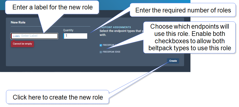 When working with FreeSpeak II, a role must be created for each beltpack or device that you use. This relationship is 1:1. If you want the same settings for multiple beltpacks, you may decide to clone an existing role.