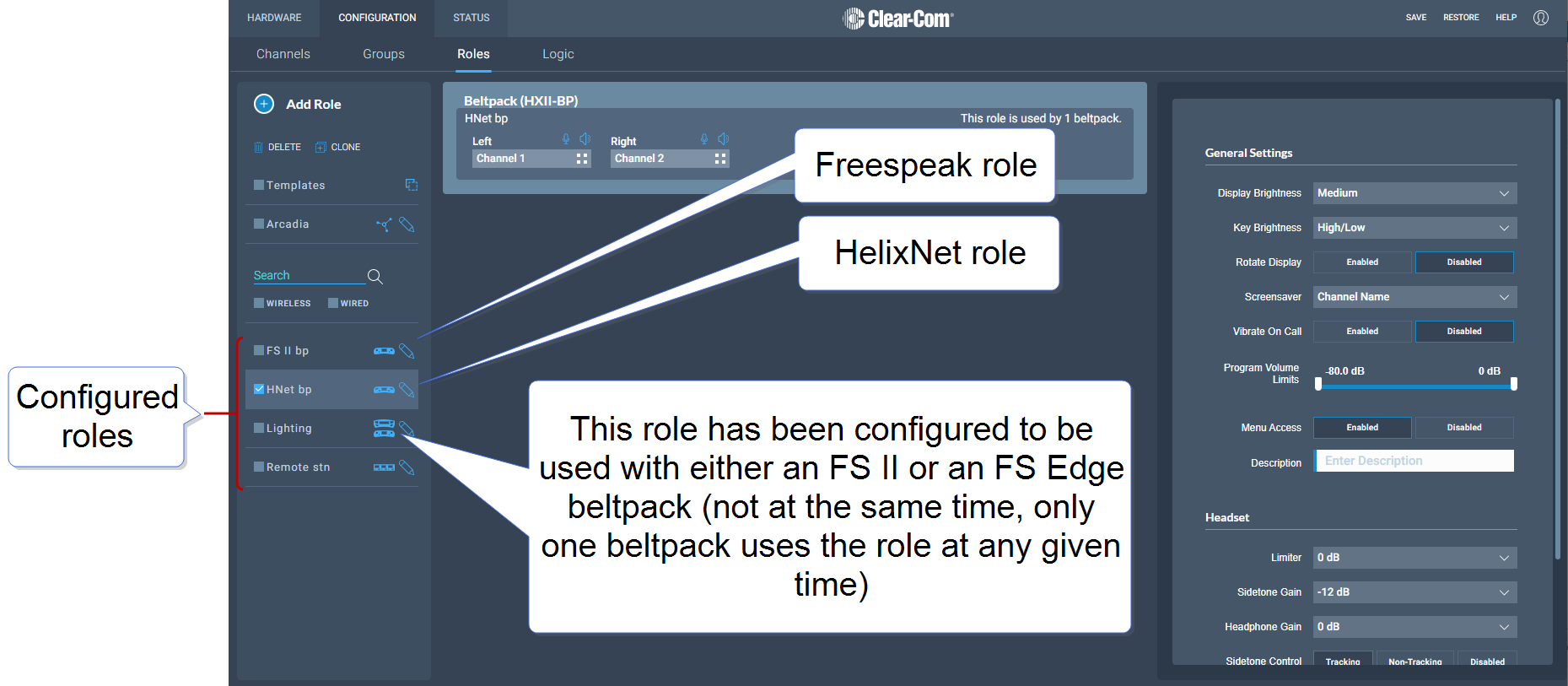 Roles are used to contol the audio configuration and other settings for beltpacks and other devices.