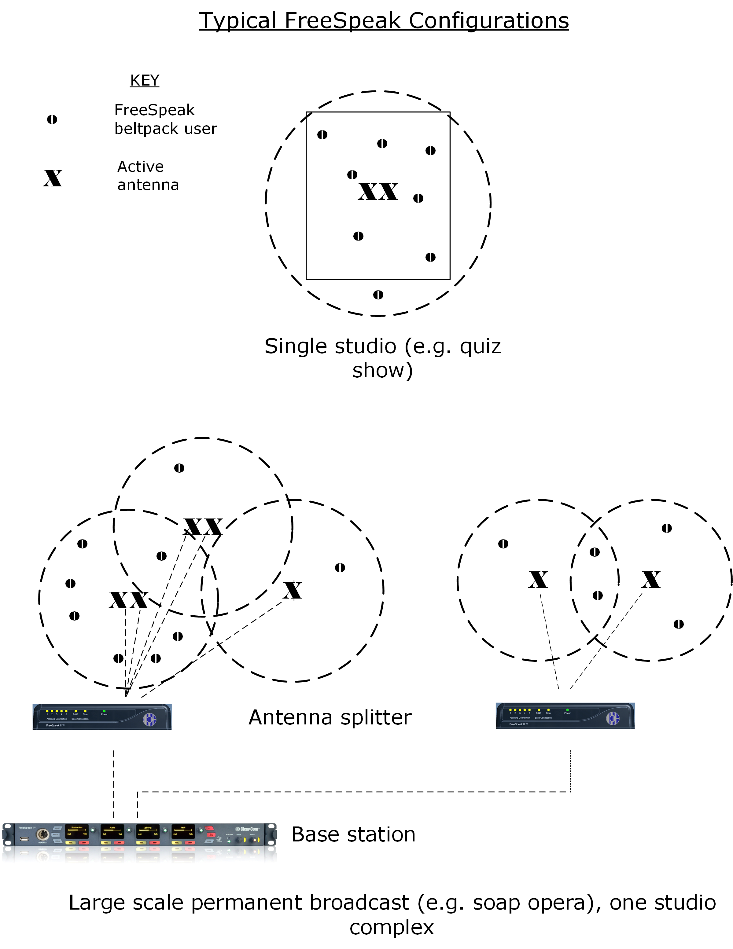 Each FreeSpeak II Base has capacity for 25 beltpacks and up to 10 transceivers (using two splitters). You need to place transceivers to create a custom coverage zone to suit your requirements, taking into account the physical environment and beltpack user needs.