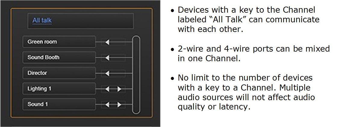 Any audio routed through the HelixNet system is contained within a Channel. Channels operate as virtual Partylines; audio sources assigned to a Channel will be able to talk and listen to all other sources assigned to the same Channel. You can use the + button to add ports to a channel.